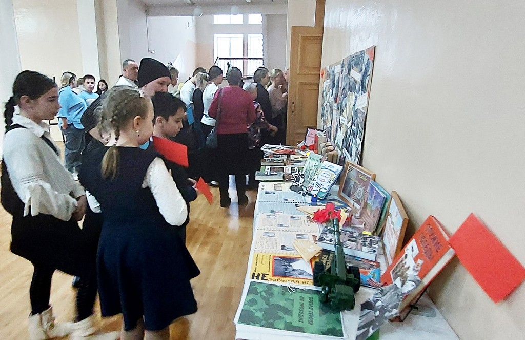 Библиотекари представили книжную экспозицию «Героями сильна Россия», а участникам мероприятия были вручены информационные буклеты «Мужество ваше на все времена».