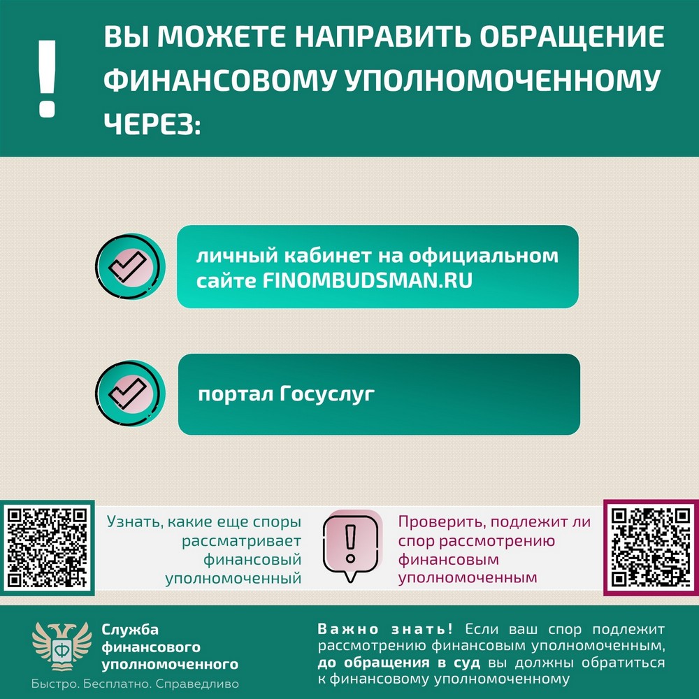 Направить обращение финансовому уполномоченному можно через личный кабинет на сайте finombudsman.ru или на портале Госуслуг.