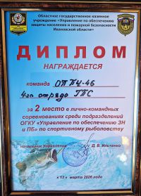 По итогам команда ОП ПЧ-46 4-го отряда ГПС награждена дипломом за 2 место в лично-командных соревнованиях среди подразделений ОГКУ «Управление по обеспечению ЗН И ПБ» по спортивному рыболовству, а Корнилов Валерий Вениаминович в личном зачёте получил диплом 3 степени и ценный подарок.
