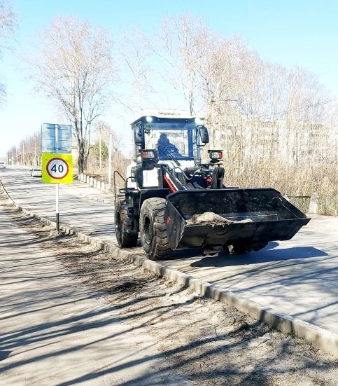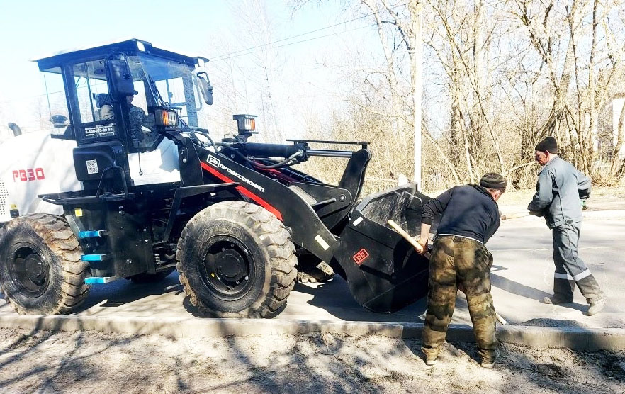Оставшаяся грязь после схода снега убирается с улиц города. Так центральная улица г. Пучежа - ул. Ленина - приводится в порядок одной из первых. Здесь и был задействован «Погрузчик фронтальный одноковшовый РВ30». Слежавшаяся пыль, земля загружается коммунальщиками в ковш спецтехники вручную, а погрузчик поднимает и сваливает ее в кузов Камаза.