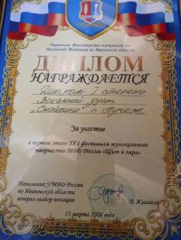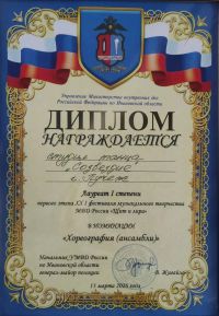 Дипломом первой степени «За участие» отмечен вокальный дуэт «Смайлики» в составе Морозовой Ирины и Бахонькиной Полины, руководитель Лапшина Таисия Евгеньевна.