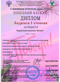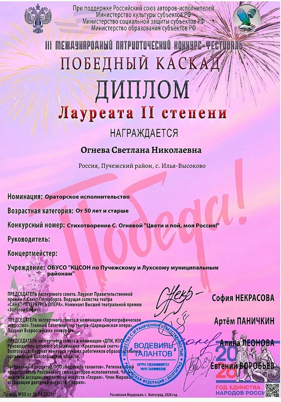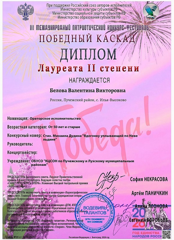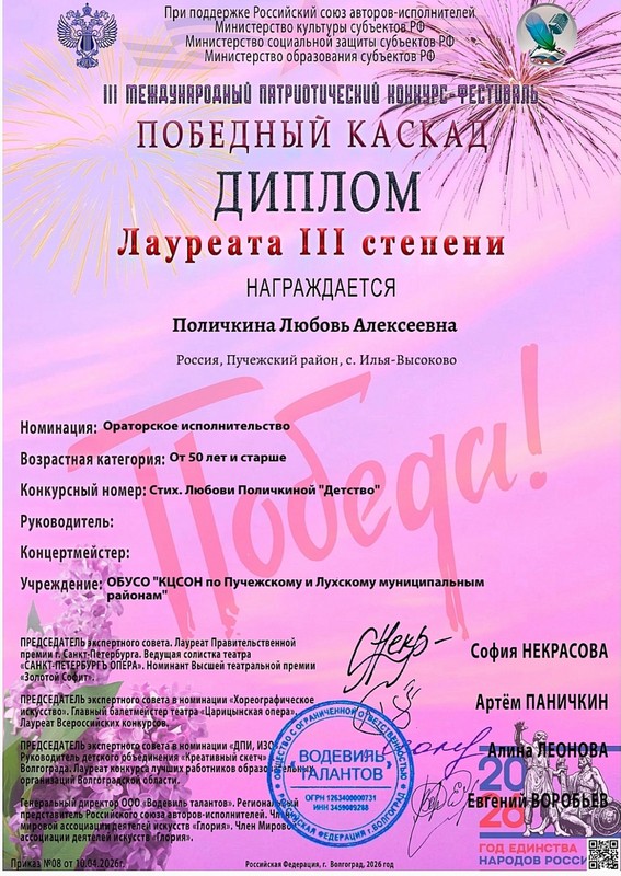В апреле 2026 года в городе-герое Волгограде в дистанционном формате прошел III Международный патриотический многожанровый фестиваль-конкурс «Победный каскад». Мероприятие было направлено на сохранение исторической памяти, развитие патриотического воспитания и совершенствование уровня исполнительского мастерства участников.