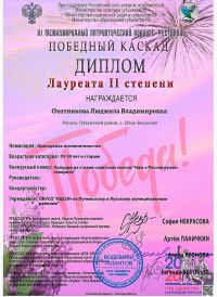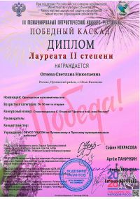 - Огнева Светлана Николаевна со стихотворением собственного сочинения «Цвети и пой, моя Россия» стала Лауреатом II степени;