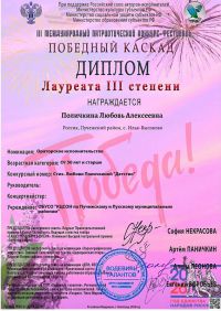 - Поличкина Любовь Алексеевна проникновенно прочитала авторское стихотворение «Детство» и получила диплом Лауреата III степени.