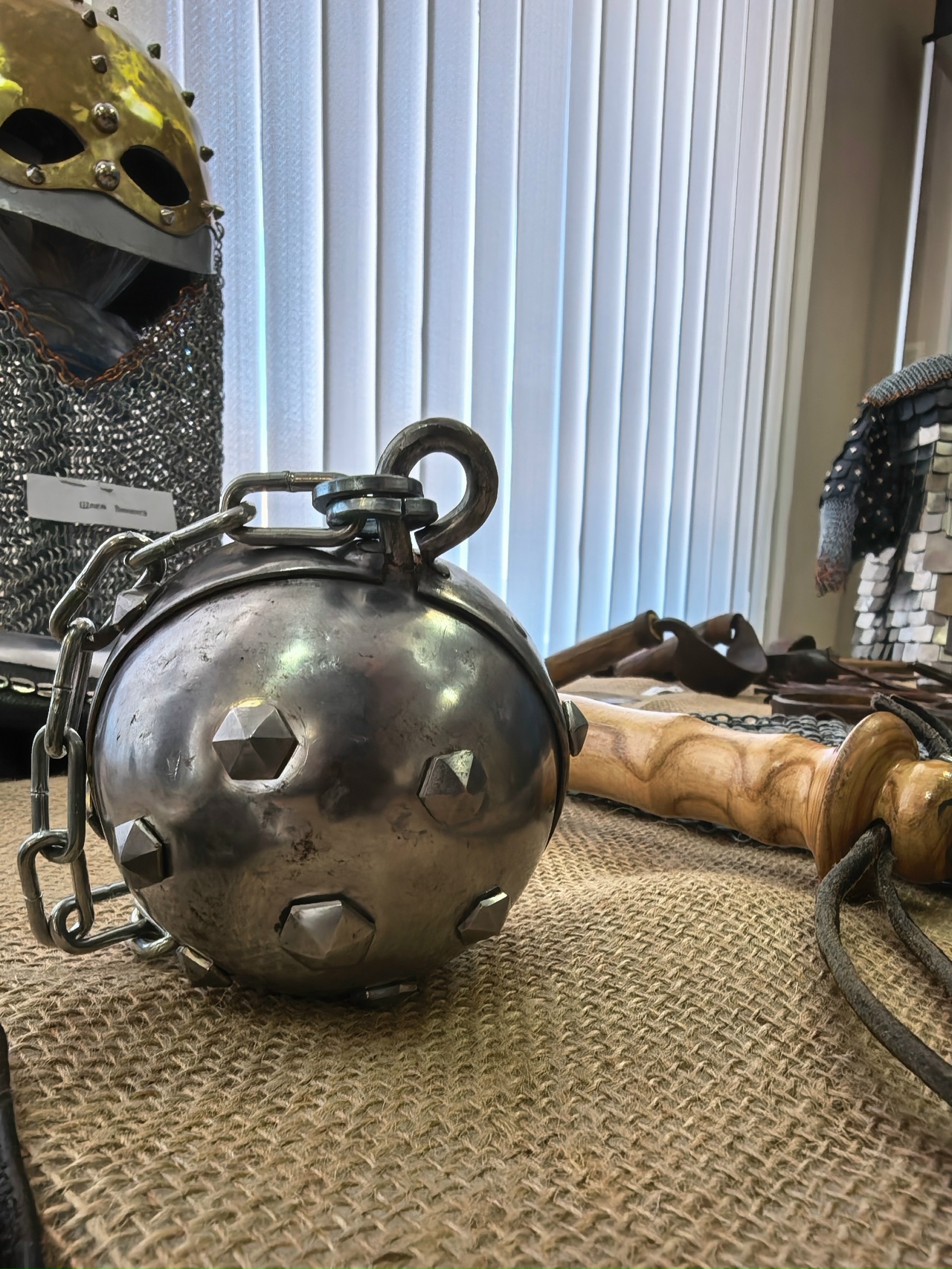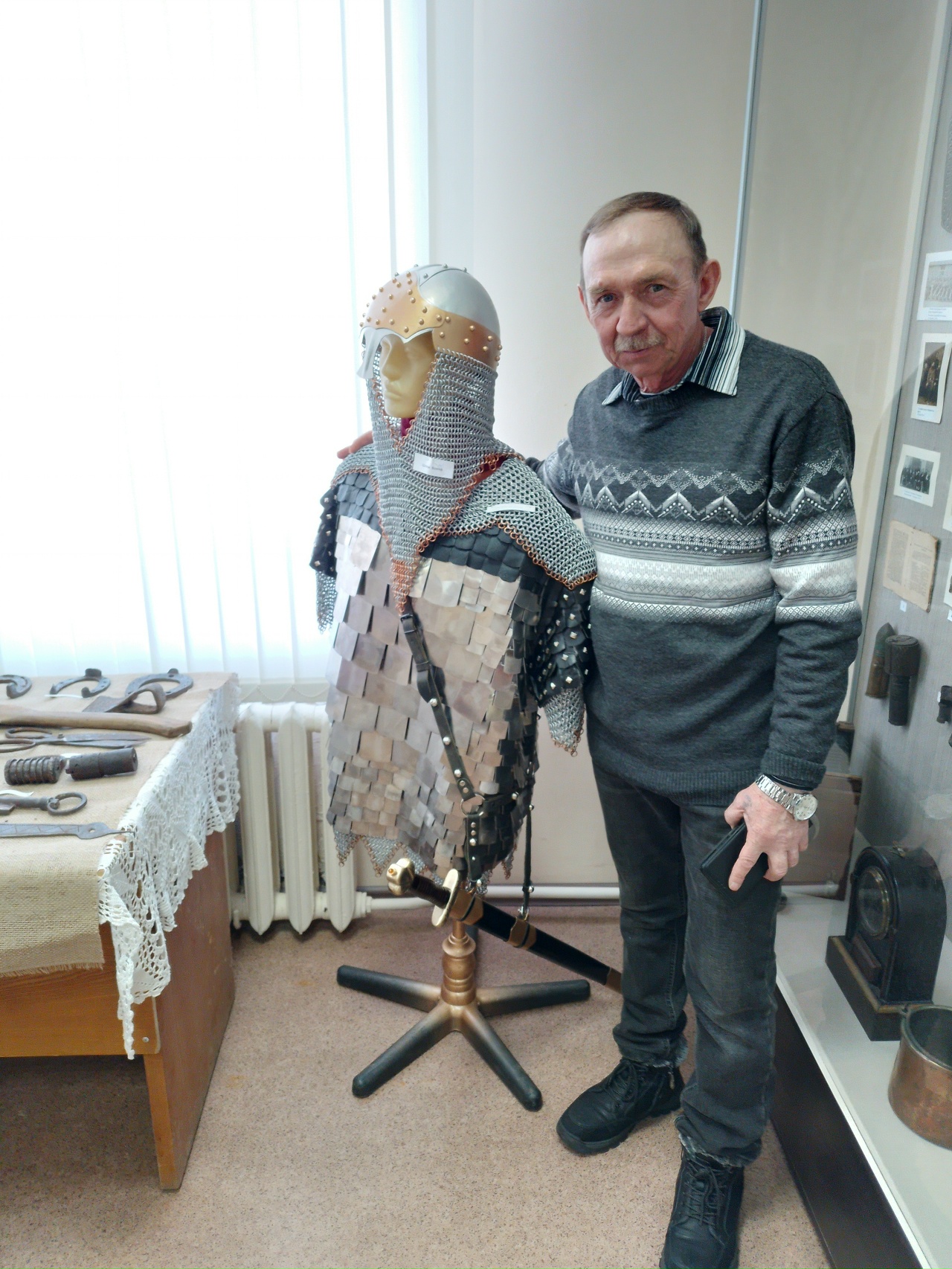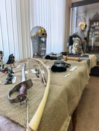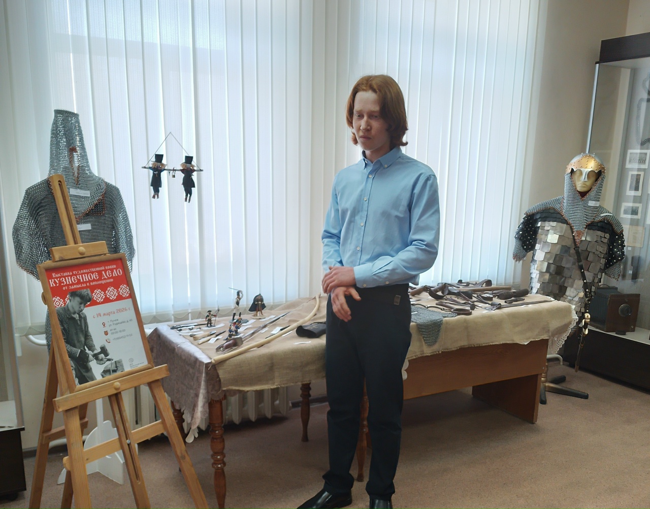 На протяжении 15 лет Владимир Мудров, житель г. Пучежа, занимается кузнечным делом. На выставке представлены его шедевральные работы: кольчуга, булава, доспехи, мечи, головные уборы - шлемы. Он рассказал участникам выставки о своем увлечении, о секретах кузнечного мастерства.